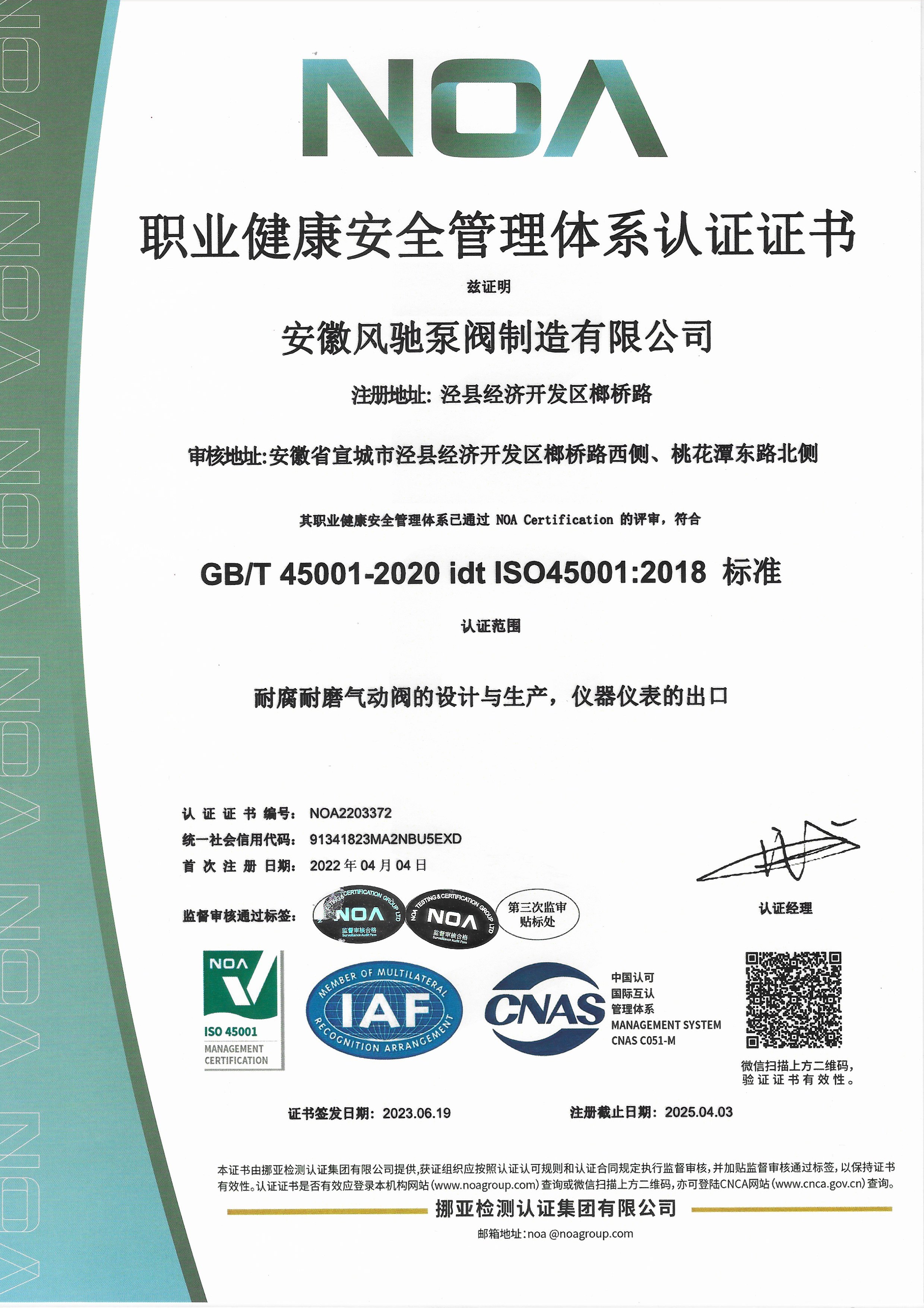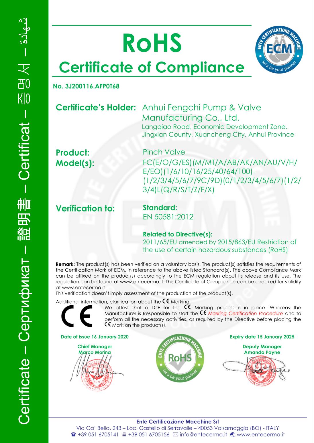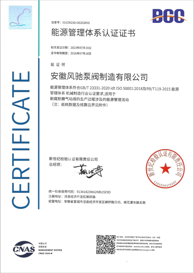 Anhui Fengchi Pump and Valve Manufacturing Co., Ltd. telah berturut-turut lulus Sertifikasi sistem manajemen mutu ISO9001-2015, Sertifikasi Sistem Manajemen Lingkungan ISO14000, sertifikasi sistem Manajemen Kesehatan dan Keselamatan Kerja ISO45001, sertifikasi EU CE, sertifikasi Rohs.